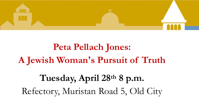 Peta Pellach Jones: A Jewish Woman's Pursuit of Truth Tuesday, April 28th 8 p.m. Refectory, Muristan Road 5, Old City