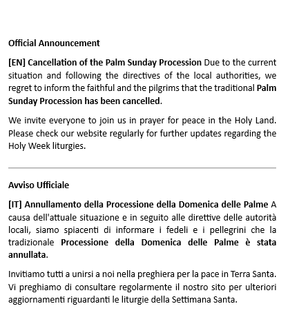 The restrictions imposed by the conflict and the events of recent days do not bode well for any imminent improvement. In constant dialogue with the competent authorities, together with the other Christian Churches, we are evaluating how, in the ways to be agreed upon, we can celebrate the central Mystery of our salvation in the heart of our Churches. The situation is constantly evolving, and it is not possible to provide definitive indications for the days to come; we will therefore be forced to coordinate on a day-to-day basis.