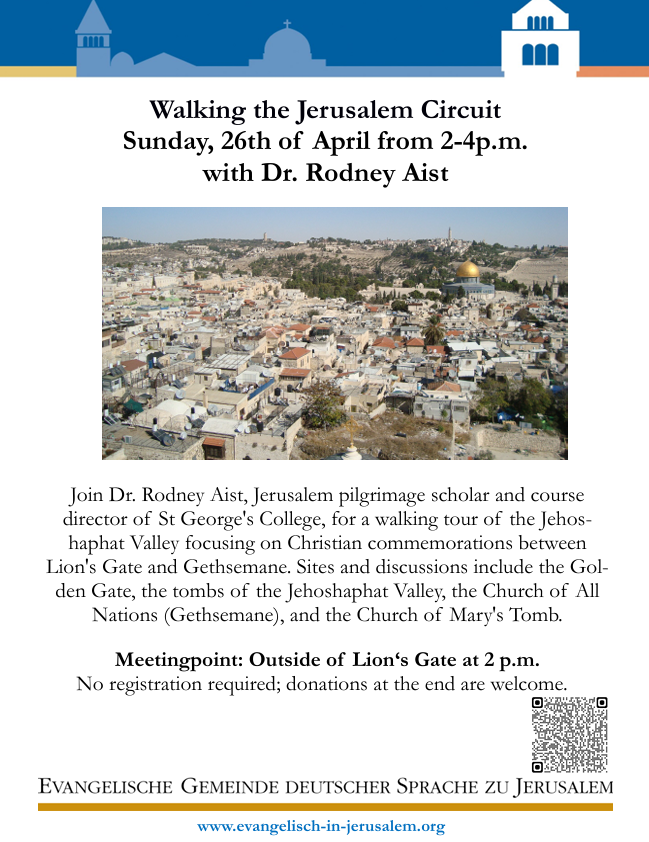Walking the Jerusalem Circuit Sunday 26 April from 14:00 - 16:00 with Dr. Rodney Aist 24 April 2026 Share Walking the Jerusalem Circuit Readarticle 24 April 2026 IMPORTANT INFORMATION - Updated as information arrives - last update 24.04.2026 Readarticle 24 April 2026 Stabat Mater Readarticle 09 April 2026 The CIC & FPO are OPEN